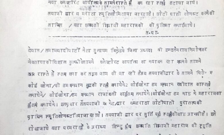 देवास। नवीन कलेक्टर कार्यालय के सामने महात्मा गांधी मार्ग पर बन रहे स्तम्भ को हटाए जाने की मांग समाजवादी पार्टी ने की है। समाजवादी पार्टी नेता मुलायम ब्रिगेड के जिलाध्यक्ष इंद्रेसनराव निमोणकर ने बताया कि नवीन कलेक्टर कार्यालय के सामने चौपाटी के समीप एक स्तम्भ का निर्माण निगम द्वारा किया जा रहा है। जिससे लोगों को कई समस्याओं का सामना करना पडेगा। आए दिन चक्का जाम की स्थिति निर्मित होगी। पहले से ही मार्ग सकरा है और स्तम्भ के बनने से ओर सकरा हो जाएगा। यदि बीच सडक पर इसी प्रकार स्तम्भ बनते रहे तो सयाजी द्वार व मराठा छोटी पाती पुरातत्व की प्राचीन स्मृति नष्ट हो जाएगी। एक स्तम्भ बनने के बाद हर कोई समाज अपने इष्ट के स्तम्भ बीच मार्ग में लगाने की मांग करने लगेगा। श्री निमोणकर ने मांग की है कि निर्माणाधीन स्तम्भ का कार्य रोका जाए। साथ ही मराठो के आराध्य हिन्दू पंथ छत्रपति शिवाजी महाराज की स्मृति सयाजी के आसपास ऐसी जगह स्थापित की जाए, जहां सडक जाम न हो व लोागो को कोई समस्या हो। यदि शीघ्र ही स्तम्भ का कार्य नही रूकता है तो समाजवादी पार्टी द्वारा विधायक, सांसद एवं महापौर को ज्ञापन दिया जाएगा।