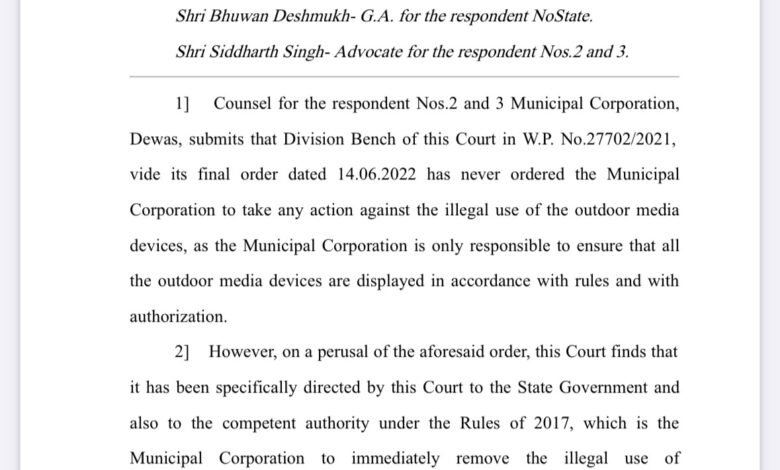 अभिभाषक मुदित माहेश्वरी ने बताया कि आउटडोर मीडिया कंपनी स्टार एडवरटाइजिंग इंडस्ट्री एवं शुक्ला पब्लिसिटी की ओर से देवास नगर निगम के खिलाफ एक याचिका हाईकोर्ट में दायर की गई थी। इसमें बताया कि उन्होंने इजाजत लेकर यूनिपोल लगाए हैं, उन पर जबरदस्ती अन्य लोग विज्ञापन लगा देते हैं, जिसके खिलाफ शिकायत के बाद भी नगर निगम कार्रवाई नहीं करता है।