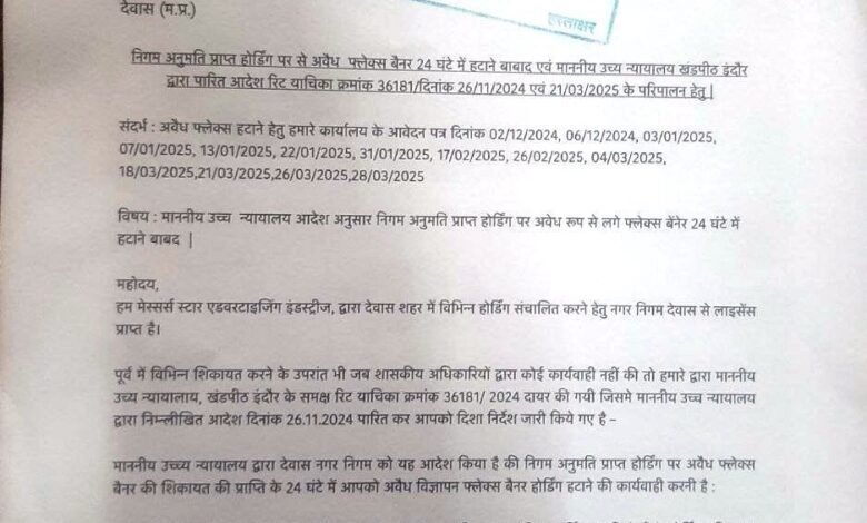 देवास होर्डिंग संचालकों की शिकायत के बाद शहर में लगे अवैध फ्लेक्सों को उतारने के कलेक्टर ने निगम को दिए आदेश,