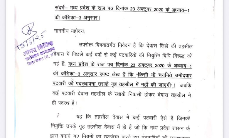 मध्य प्रदेश के राजपत्र, दिनांक 23 अक्टूबर 2020, अध्याय-1 की कंडिका-3 के अनुसार यह स्पष्ट निर्देशित किया गया है कि “किसी भी चयनित उम्मीदवार पटवारी की पदस्थापना उसके गृह तहसील में नहीं की जाएगी।” इसके बावजूद, देवास तहसील में कई ऐसे पटवारी कार्यरत हैं जो इसी तहसील के स्थायी निवासी हैं।