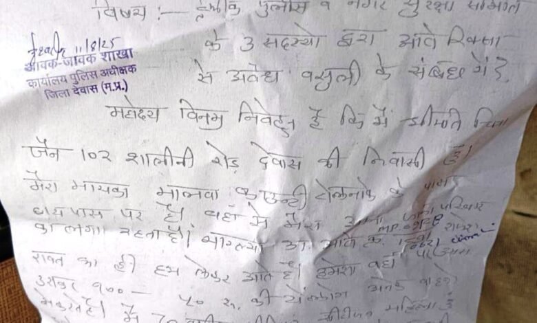 देवास ट्रैफिक पुलिस और सुरक्षा समिति के सदस्यों पर अवैध वसूली का आरोप, सीनियर सीटीजन महिला ने दिया आवेदन,