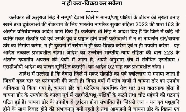 देवास कलेक्टर श्री ऋतुराज सिंह ने नायलोन डोर/चायना डोर के संबंध में प्रतिबंधात्मक आदेश किए जारी,