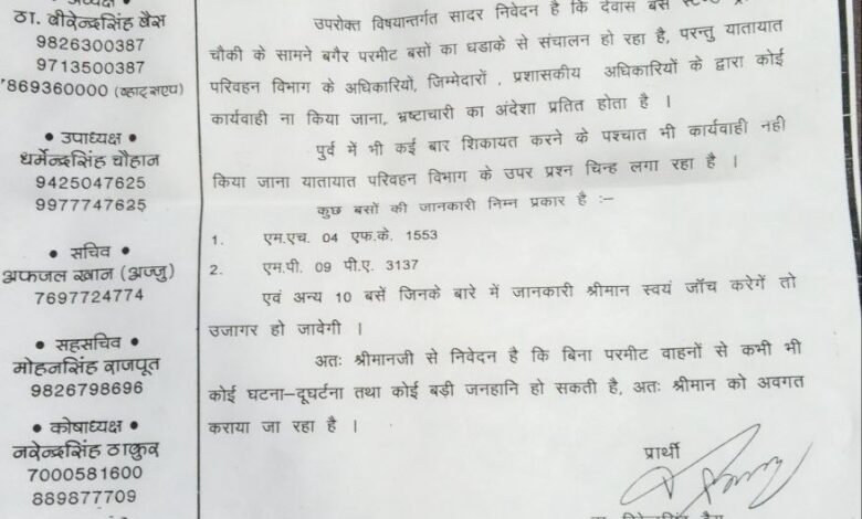 – प्राइम रूट बस ऑपरेटर्स एसोसिएशन ने एसपी को दिया आवेदन देवास-इंदौर मार्ग पर अवैध रूप से बिना परमिट बसों का संचालन खुलेआम किया जा रहा है। हैरानी की बात यह है कि यह सब देवास बस स्टैंड स्थित ट्रैफिक चौकी की नाक के नीचे हो रहा है। इसके बावजूद परिवहन एवं यातायात विभाग द्वारा अब तक कोई ठोस कार्रवाई नहीं की गई है। प्राइम रूट बस ऑपरेटर्स एसोसिएशन अध्यक्ष ठा. विरेन्द्र सिंह बैस ने पुलिस अधीक्षक को आवेदन दिया है। श्री बैस ने आवेदन में बताया कि बिना परमिट संचालित बसें न केवल नियमों का उल्लंघन कर रही हैं, बल्कि यात्रियों की जान के साथ भी खिलवाड़ कर रही हैं। श्री बैस ने बताया कि पूर्व में भी कई बार शिकायतें की जा चुकी हैं, लेकिन कार्रवाई न होना विभागीय कार्यप्रणाली पर सवाल खड़े करता है। शिकायत में कुछ बसों के नंबर भी उजागर किए गए हैं, जिनमें एमएच 04 एफके 1553 और एमपी 09 पीए 3137 शामिल हैं। इसके अलावा लगभग 10 अन्य बसों के भी अवैध संचालन की बात कही गई है। एसोसिएशन ने आशंका जताई है कि यदि समय रहते कार्रवाई नहीं की गई तो कभी भी बड़ा हादसा हो सकता है, जिसकी जिम्मेदारी संबंधित विभागों की होगी। मामले की प्रतिलिपि जिला परिवहन अधिकारी एवं यातायात प्रभारी देवास को भी भेजी गई है।