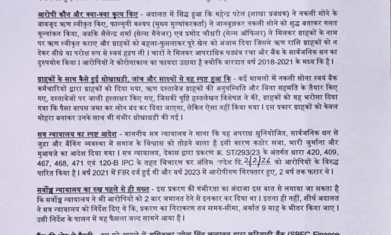 दोषियों में महेंद्र पटेल (शाखा प्रबंधक), फाल्गुनी कश्यप (मुख्य मूल्यांकरकर्ता), शैलेन्द्र शर्मा (सेल्स मैनेजर) और प्रमोद चौधरी (सेल्स ऑफिसर) शामिल हैं। अदालत में सिद्ध हुआ कि आरोपियों ने आपराधिक षड्यंत्र रचकर नकली सोने के आधार पर ऋण स्वीकृत किए और ग्राहकों को मोहरा बनाकर राशि हड़प ली। यह फर्जीवाड़ा 2018 से 2021 के बीच हुआ।