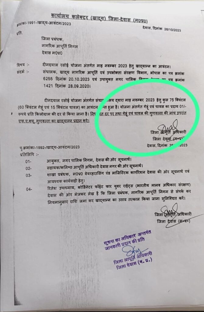 कार्यालय कलेक्टर खाद्य जिला देवास द्वारा प्रदान दस्तावेज के आधार पर वर्तमान ठेकेदार प्रतिदिन 3 क्विंटल गेहूं चावल प्राप्त कर रहा है जबकि ग़रीबों को हमेशा रोटी खत्म होने का बोलकर भगा देता है और चलित रसोई का संचालन भी मात्र एक दो घंटे कर के गरीबों के हक़ पर डाका डालता है।